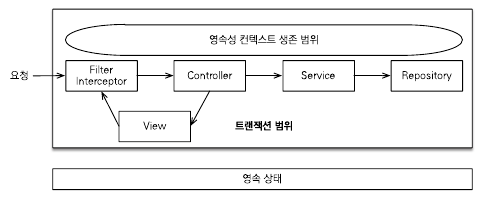 - 위 그림처럼, 클라이언트의 요청이 들어오자마자 서블릿 필터나 스프링 인터셉터에서 영속성 컨텍스트를 만들면서 트랜잭션을 시작하고, 요청이 끝날 때 트랜잭션과 영속성 컨텍스트를 함께 종료한다.